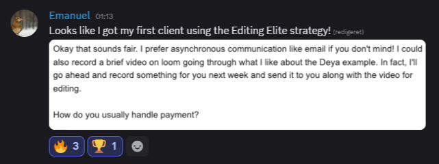 "I joined Editing Elite about 45 days ago, and today I got my first €3000/mo retainer client"