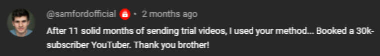 ...until I stopped doing the one thing everyone else was doing wrong.In my first few months of taking video editing seriously...reality hit me hard.❌ I sent countless DM’s to creators… No one responded.❌ I spent hours on making trial videos… Only to receive: “currently not looking for a new editor”❌ I started an ‘X profile’, gaining more and more followers… But only ever getting crap offersWhy was nothing working?I felt like a complete failure.Just another guy who thought he could "make money with video editing" but had nothing to show for it.Then, I had a realization that changed everything.Instead of trying to do what everyone else was doing, what if I tried doing it in my own way?I put together a plan and tested a new way of getting clients for video editors...And within the first week of using it,