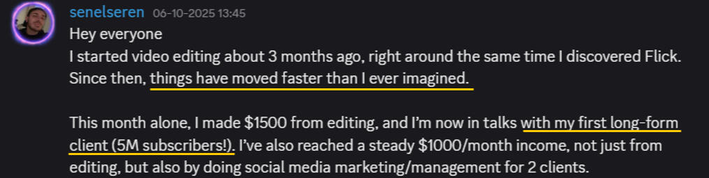 I started video editing about 3 months ago, right around the same time I discovered Flick. Since then, things have moved faster than I ever imagened.I'm now in talks with my first long-form client (5M subscribers!)