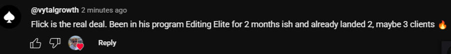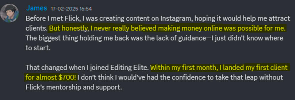 "I joined Editing Elite about 45 days ago, and today I got my first €3000/mo retainer client. I used every step Flick and his team gave me"