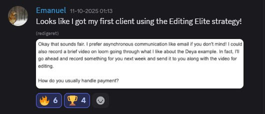 "I joined Editing Elite about 45 days ago, and today I got my first €3000/mo retainer client"