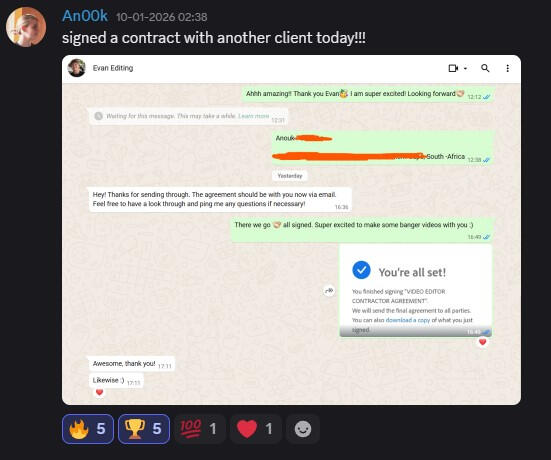 "I joined Editing Elite 45 days ago, and today I got my first €3000/mo retainer client."